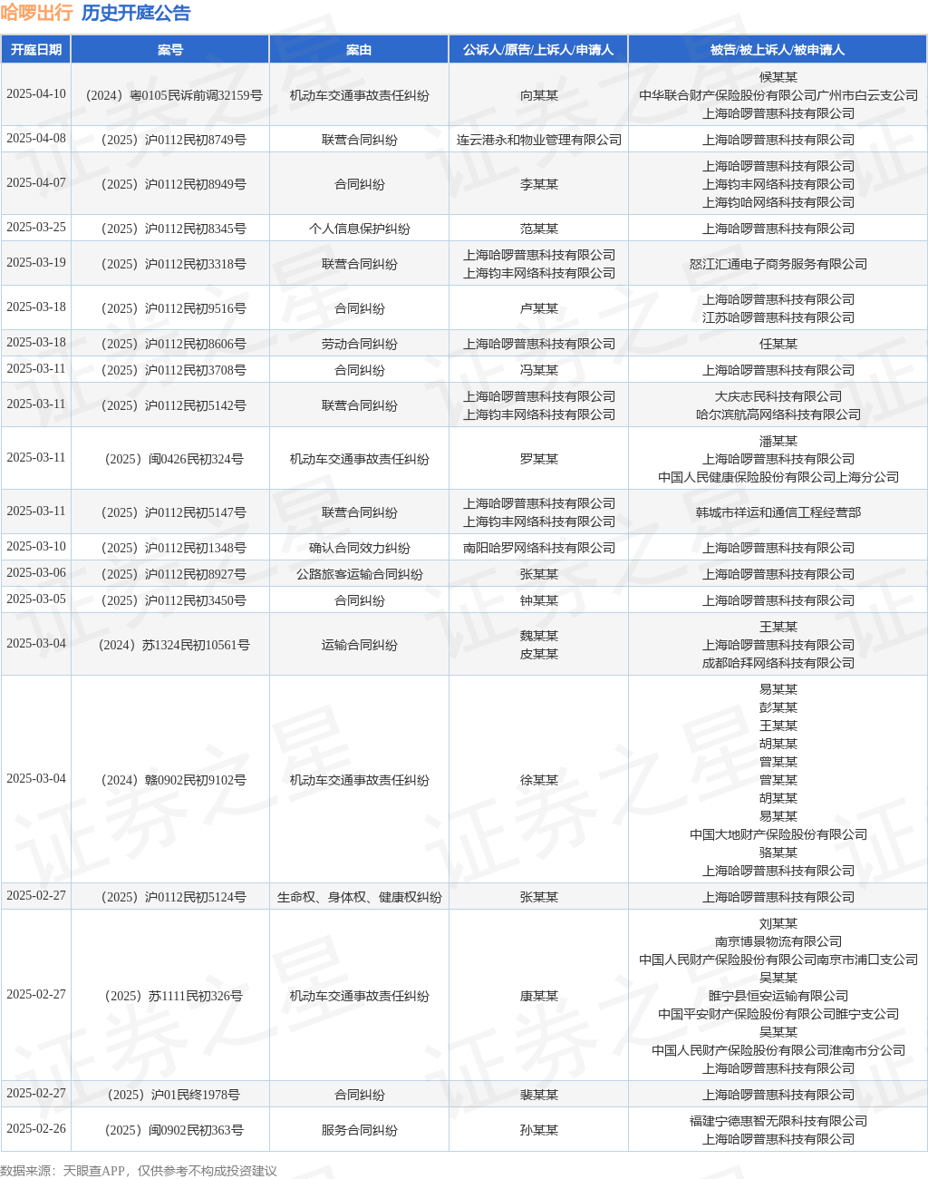 案号:(2024)冀1002民初7010号审理法院:廊坊市安次区人民法院案由:合同纠纷当事人信息: 原告/上诉人:廊坊市公共交通运输集团有限公司 被告/被上诉人:上海哈啰普惠科技有限公司开庭日期:2025年2月18日根据统计,近一年内以上海哈啰普惠科技有限公司为当事人的历史开庭公告有273则,其中案由为“机动车交通事故责任纠纷”的公告以80则居首,其次为“合同纠纷”有27则,“生命权、身体权、健康权纠纷”有18则。历史开庭公告(前20条)如下: